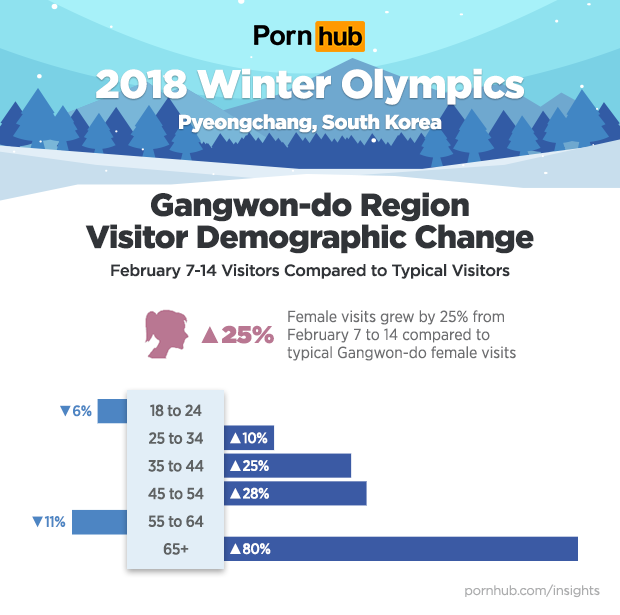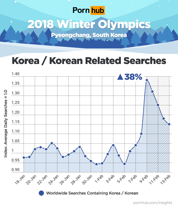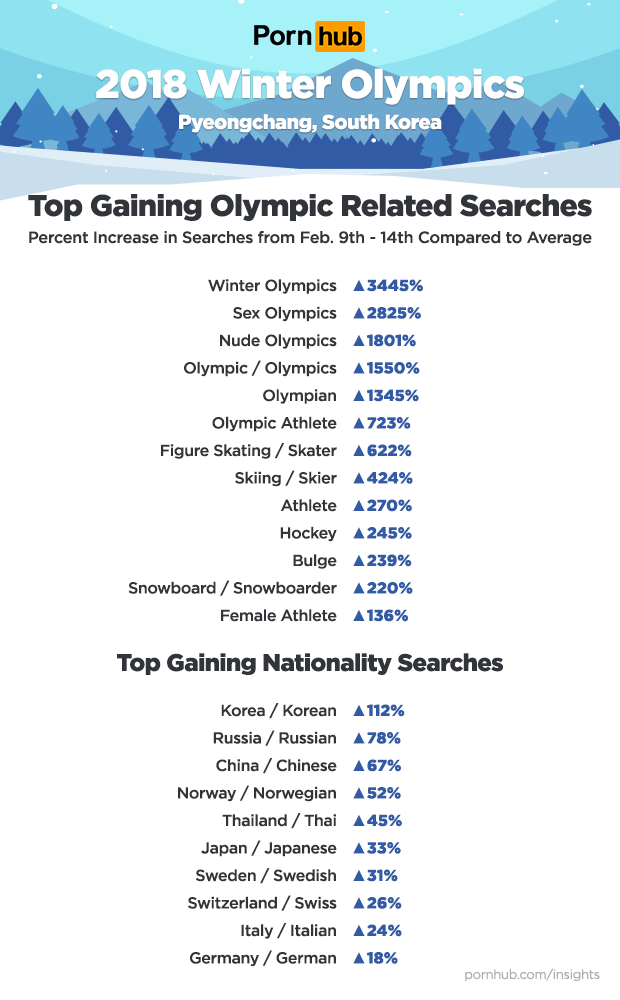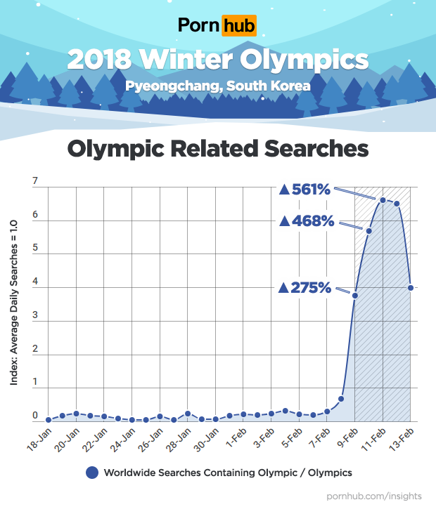 The 2018 Winter Olympics opened February 9th in Pyeongchang, South Korea. As people all over the world tuned in to watch their favorite winter sports, the excitement soon flowed over to Pornhub where searches containing “Olympic” and “Olympics” grew by up to 561% compared to average levels.