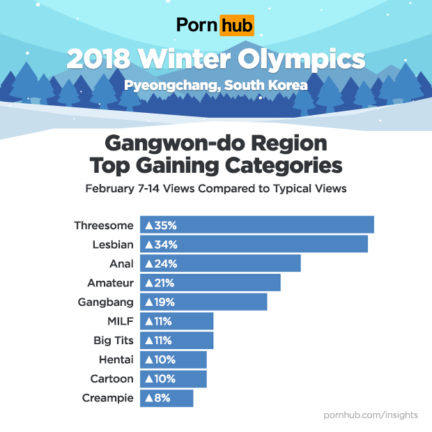 To see what type of porn the Olympic athletes and spectators were most interested in watching, our statisticians compared the popularity of categories in Gangwon-do from February 7-14 to that of typical visitors from the region. We found that the “Threesome” category increased the most by 35% in popularity, perhaps indicating that some athletes were interested in teaming up with new partners during their time in Pyeongchang.  The popularity of the “Lesbian” category increase by 34% “Anal” by 24%.