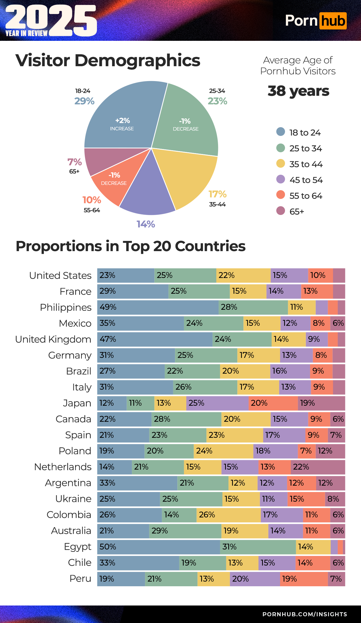 Jumping up two spots to the 2nd top country by traffic this year was Mexico, dropping France down –4 spots (a drop that was impacted by our decision to suspend access to France, where the French government is focused on futile and entirely symbolic regulatory actions which are unenforceable, do not protect children and expose private data). The Philippines remained as the 3rd top country by traffic again this year, holding the same spot as 2024.