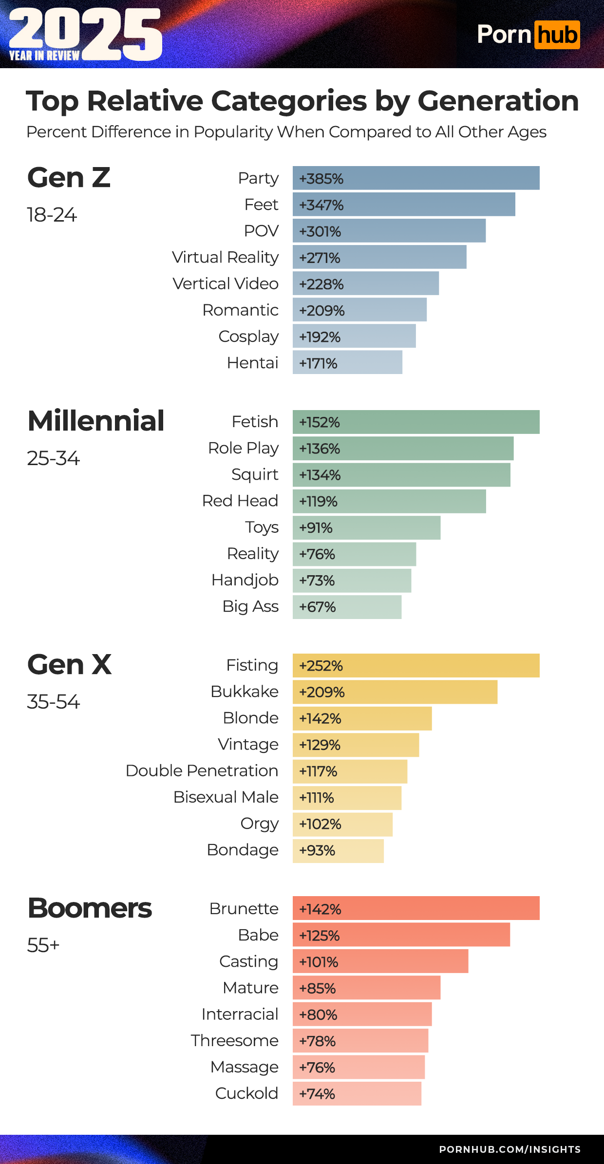 It might be counter-intuitive to think people come to Pornhub for safe-for-work content, but over the years it has been impossible to deny its rising popularity. Some of the top gaining categories of 2025: Podcast up +327%, Gaming up +283%, and Music up +62% shows users’ interest in creators and sexuality goes beyond pornography. It extends into their real lives, humanizing these performers as somebody with hobbies and passions.