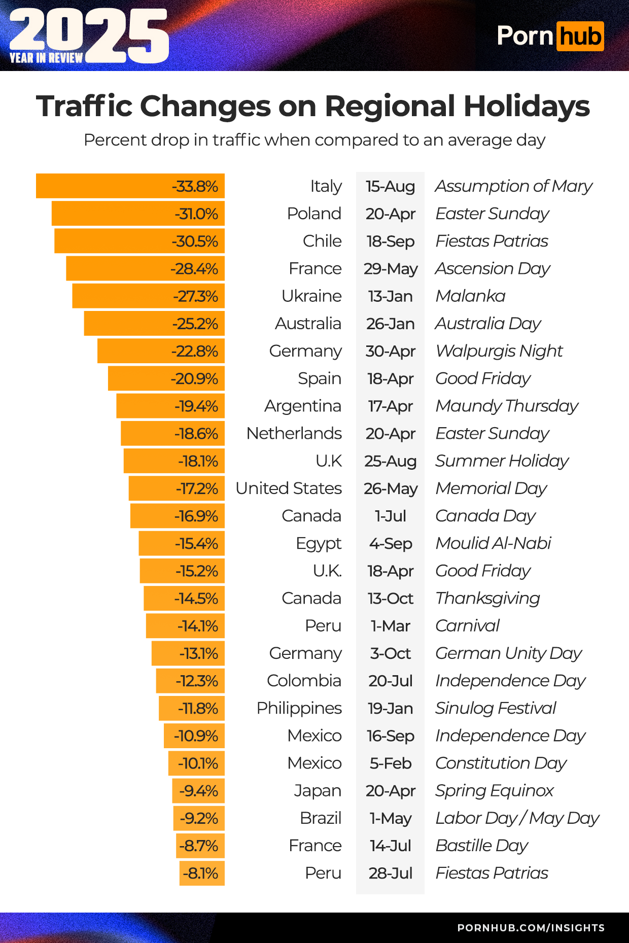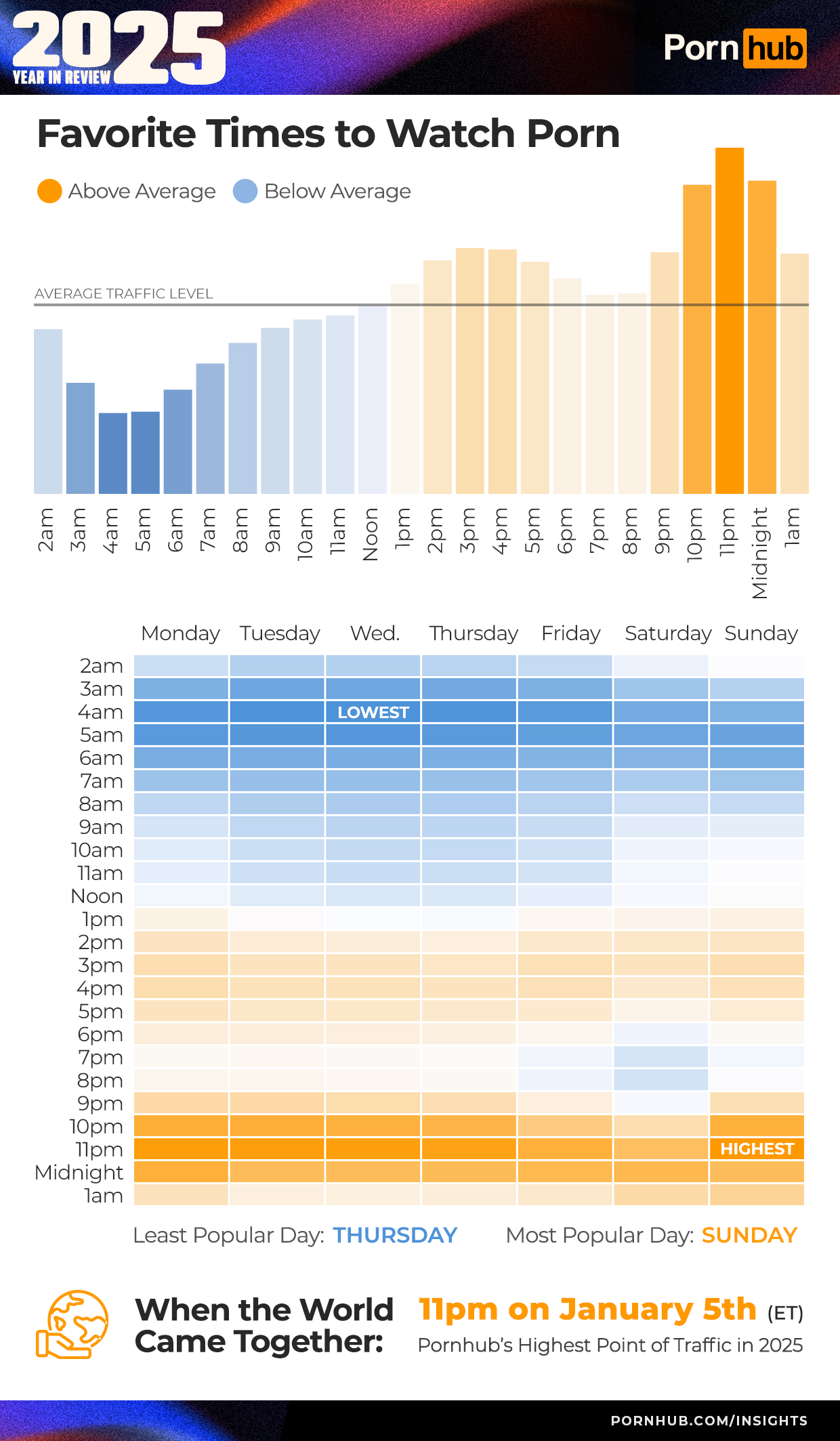 Finally, Pornhub’s highest point of traffic in 2025 was January 5, at 11pm, when the world came together. Why? We asked. There were several factors that could contribute to the high traffic. 1) The Golden Globes ended at 11pm that night. 2) The Lions vs Vikings football game ended at 11pm that night. And 3) There was a big winter storm across much of the United States, which meant more people were at home, indoors. Together, it created the perfect conditions for high traffic to people’s favorite site to end the night.