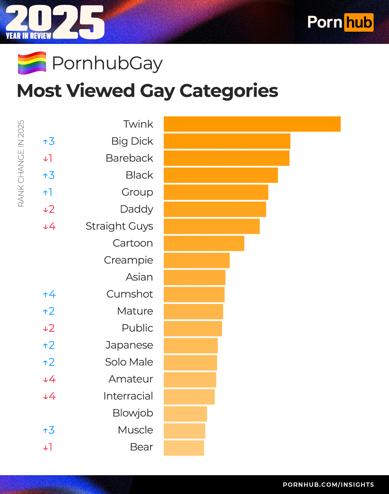 The world’s most popular categories don’t often change too drastically. Over the years, Lesbian, Transgender, MILF, Anal, and Mature have generally conquered the top 5 spots. This year, in going with the LGBTQ+ trend, the Lesbian category was the topmost viewed of 2025, up +3 spots from 2024. Transgender was also up +5 spots from 2024, further establishing the LGBTQ+ trend of 2025.