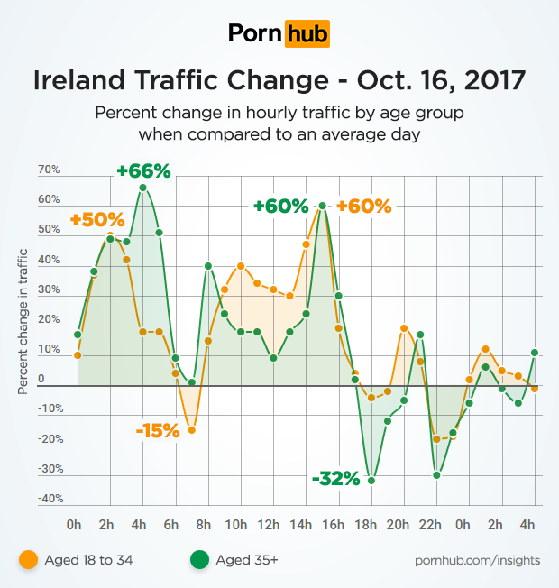 Similar October 16th differences were found depending on the age of Irish visitors. Irish millennials between the ages of 18-34 saw an increase of 50% at 02:00, while those over 35 years of age increased by 66% above their usual levels at 04:00. Millennial traffic was down 15% at 07:00, but all age groups seem to have agreed that 15:00 was an optimum time for a Pornhub break with a 60% increase above daily levels. At 18:00 traffic from Irish visitors over the age of 35 was down 32% compared to their average, but remained relatively normal for the millennial group.
