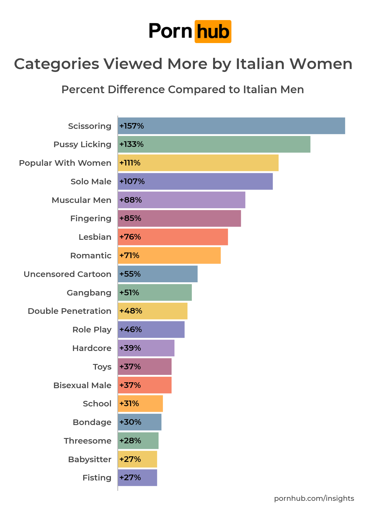 After that obvious first place, we find something we didn’t expect: “Virtual reality”, that is +147% more likely to be seen by Italian Women. Looks like Italian women like to use technology to plunge deep in hot scenes.