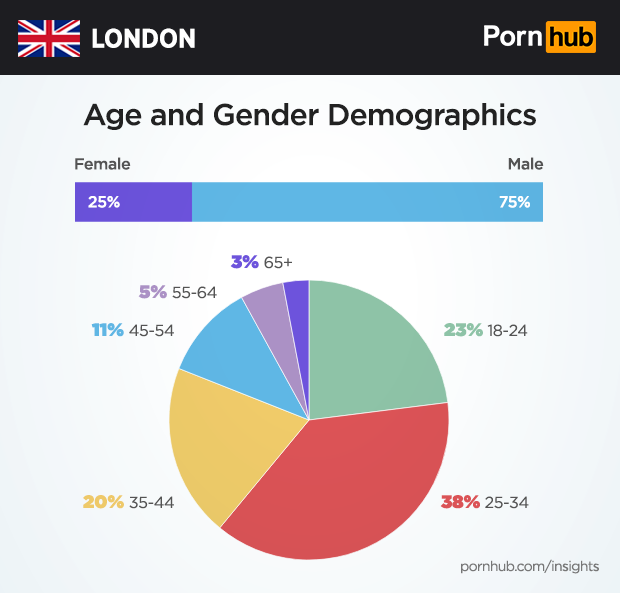 Women account of 25% of London’s Pornhub visitors, just slightly ahead of the U.K. average of 24%. Perhaps due to the cost of living, London has a much smaller proportion of 18-24 year old visitors — only 23% compared to the U.K. average of 31%. There are however significant gains in visitors 25-34 (38% vs 30%) and 35-44 (20% vs 16%).