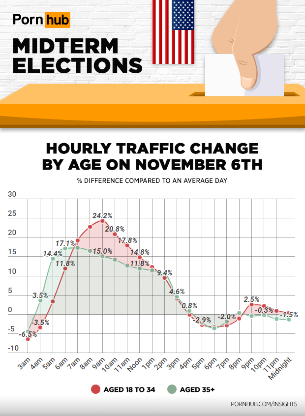 Midterm elections took place in the United States on November 6th, as voters headed to the polls to choose who their representatives in the House and Senate would be for the next four years. Rather than analyzing what the political results might be, Mashable asked Pornhub’s statisticians to see how election day affected Pornhub’s traffic.